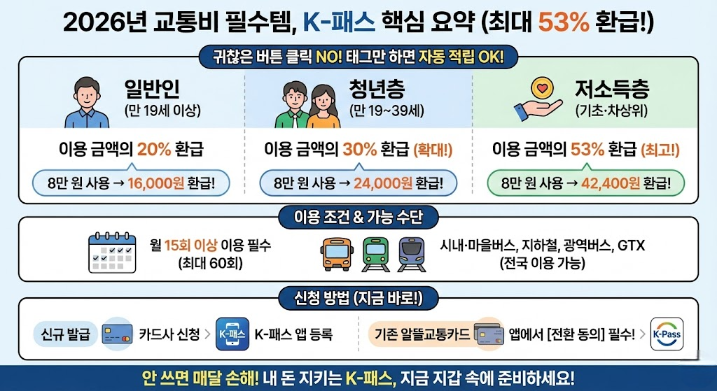 [2026년 필수템] 교통비 매달 53% 돌려받는 'K-패스' 완벽 정리 (구 알뜰교통카드 이용자 필독!)